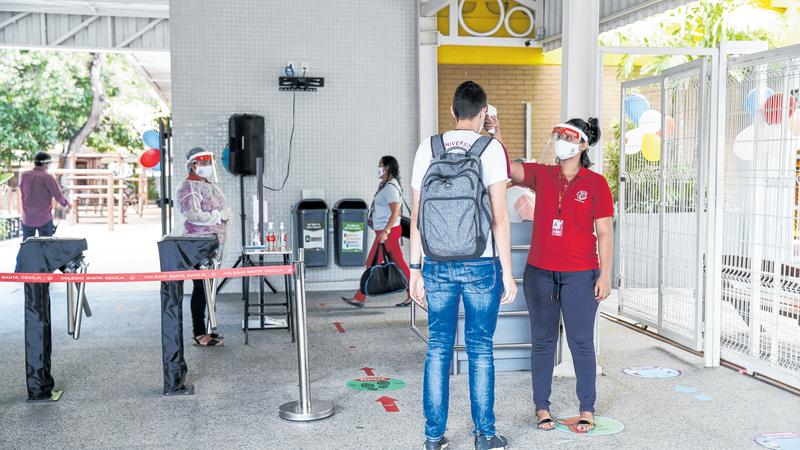 Os passos chegam tímidos, mesmo com o ambiente conhecido - afinal, foram mais de seis meses longe da escola -, e encontram um tapete encharcado de uma solução desinfetante. Um funcionário mede a temperatura com um termômetro e orienta higienizar as mãos com álcool em gel. Em algumas unidades, até as mochilas são limpas com o produto. O protocolo de retomada nas escolas privadas de Fortaleza é semelhante, mas, nesta quinta (1º), foi ampliado para mais quatro séries além do Ensino Infantil, reaberto desde setembro.